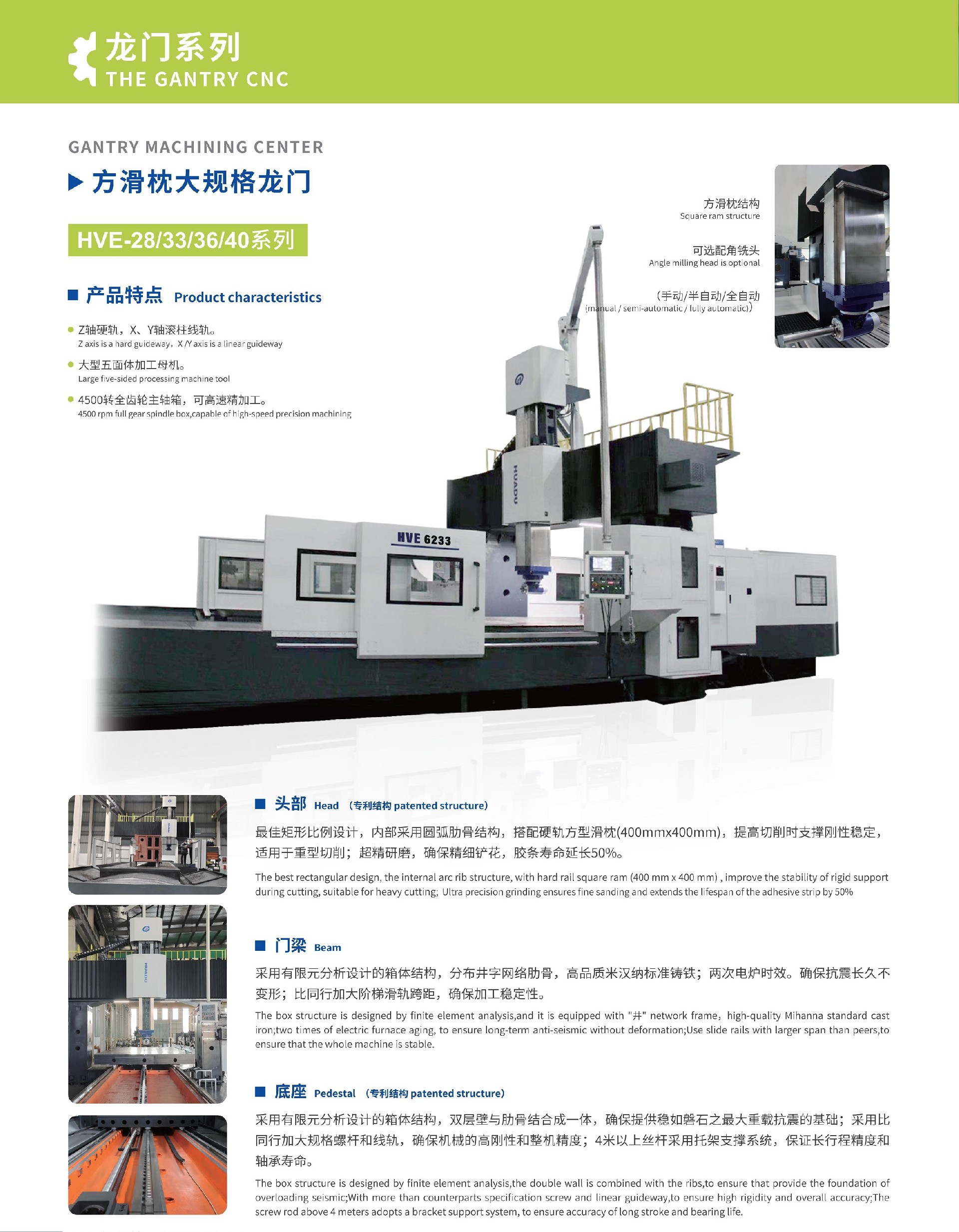 產(chǎn)品特點:Z軸硬軌,X、Y軸滾柱線軌;4500全齒輪,可高速精加工;大型五面加工母機(jī);選配角銑頭;