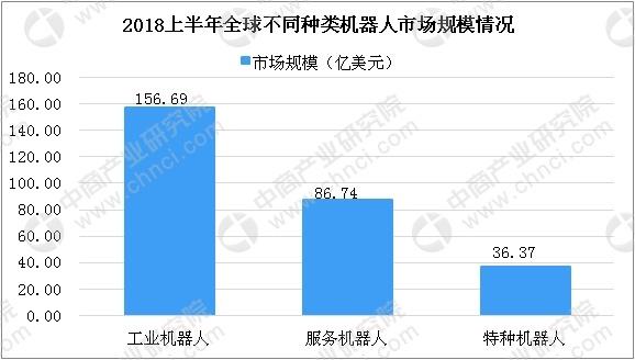 在市場(chǎng)構(gòu)成方面,2018上半年全球工業(yè)機(jī)器人市場(chǎng)規(guī)模為156.69億美元,占整體機(jī)器人市場(chǎng)規(guī)模的56.0%,服務(wù)機(jī)器人市場(chǎng)規(guī)模為86.74億美元,收入占比為31.1%;特種機(jī)器人市場(chǎng)規(guī)模為36.37億美元,市場(chǎng)收入占比為13.0%。