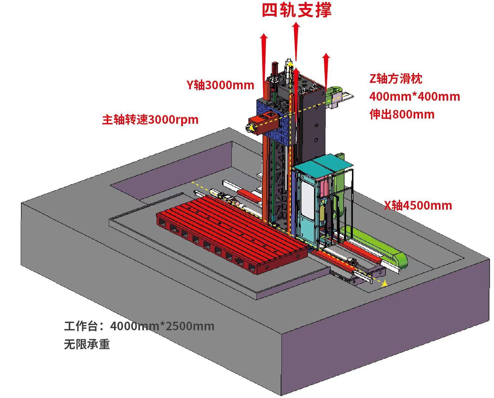 主軸齒輪箱采用全齒輪兩檔位變速,日本濱田齒輪,噪音小,溫升低,最大扭矩可達(dá)2867N.m;采用“箱中箱”結(jié)構(gòu),方滑枕完全包絡(luò)在滑鞍中,滑鞍嵌在“雙回”型立柱中,沿立柱前端面兩條重型硬軌,立柱后端面兩條重型65#滾柱導(dǎo)軌上下滑動。具有超強(qiáng)的剛性,滑枕全行程僅有0.015mm下垂量。
